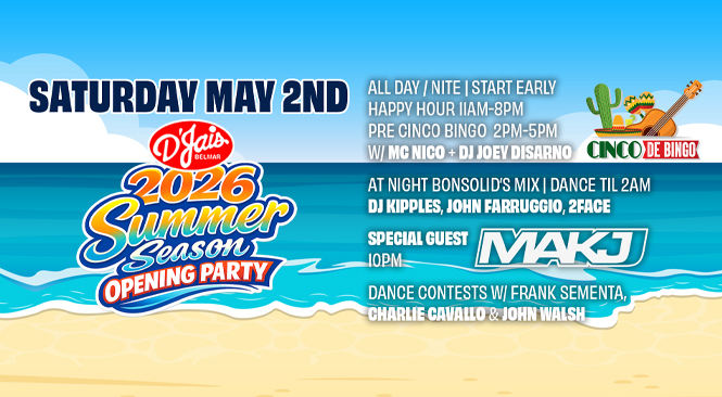 D'Jais 1801 Ocean Ave, Belmar, NJ, United StatesHolme Sun Oct 12 at DJais is cancelled due to dangerous nor’easter in weather forecast..we will announce rescheduled date asap D’Jais Local Summer Sunday w/Holme Sunday October 12th 4PM Early Show 2:30PM Free Buffet! Plus Special Holme Band T-Shirt Raffle! All Day/Night Happy Hour w/ our Special Fall Football Menu