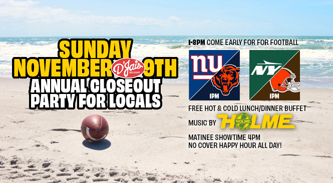 Annual Closeout Party for Locals Come Early Watch NY Giants at 1PM also NY Jets 1PM Free Hot & Cold Lunch/Dinner Buffet at Halftime Music by Holme Band Matinee Showtime 4pm No Cover |